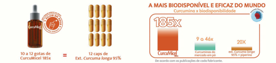 CurcuMicel® 185x é a solução que vence o desafio da baixa biodisponibilidade, foi elaborado com tecnologia exclusiva em estrutura micelar natural, sendo a cúrcuma mais biodisponível do mundo, disponível na FORMA LÍQUIDA, totalmente solúvel.
